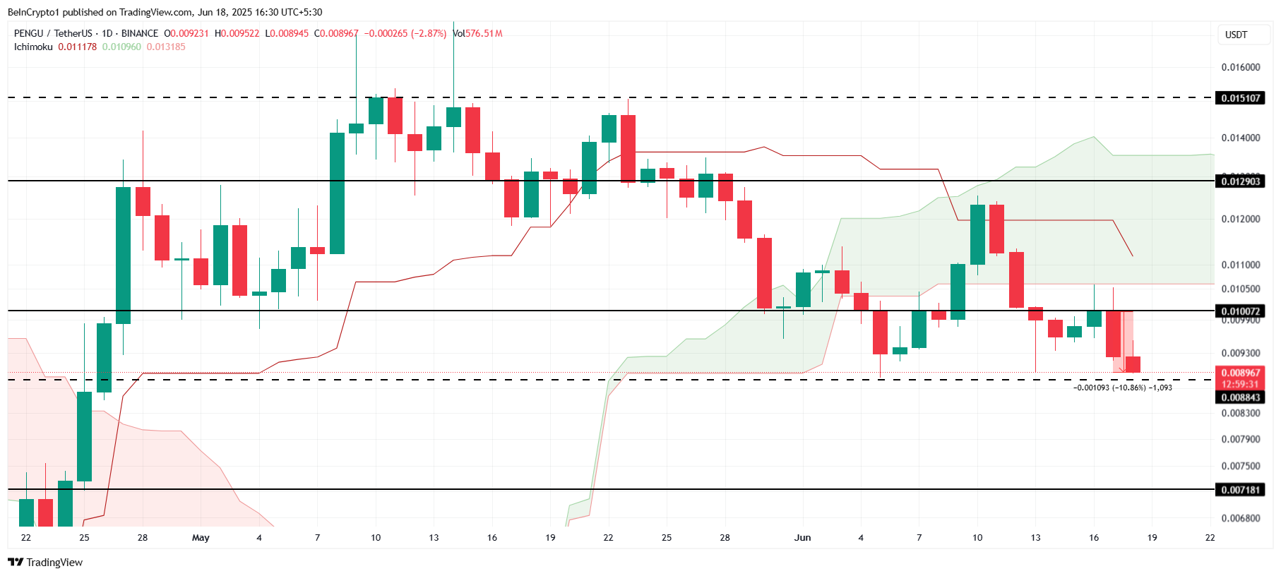 Ichimoku Cloud đang báo hiệu động lực tăng mạnh cho meme coin này, gợi ý khả năng bật lên từ mức hỗ trợ 0.0088 USD. Nếu PENGU thành công vượt qua và chuyển 0.0100 USD thành hỗ trợ, nó có thể kích hoạt sự phục hồi và mở đường cho các mức giá cao hơn.