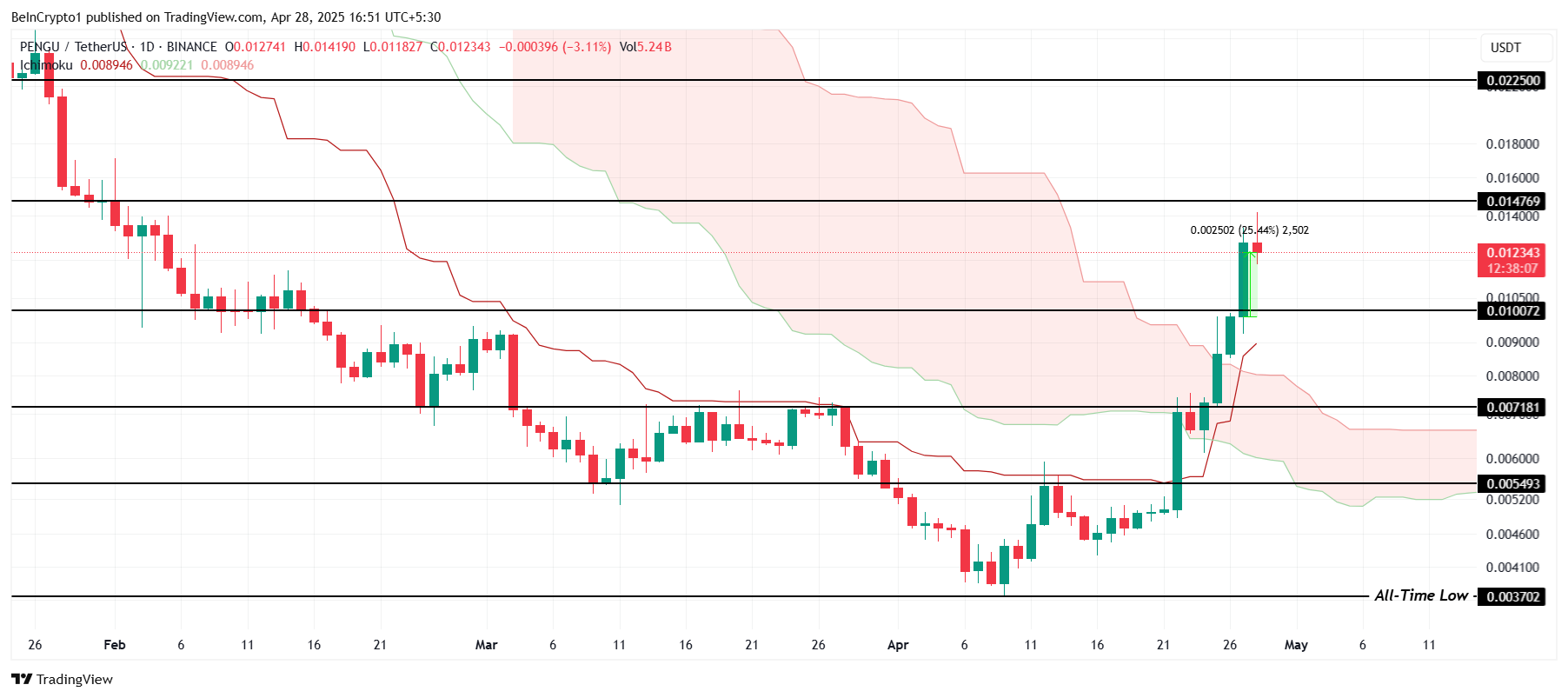 Một đột phá trên mức kháng cự 0.0147 USD có thể đưa PENGU lên mức 0.0225 USD, cho thấy tiềm năng tiếp tục tăng trong những ngày tới.