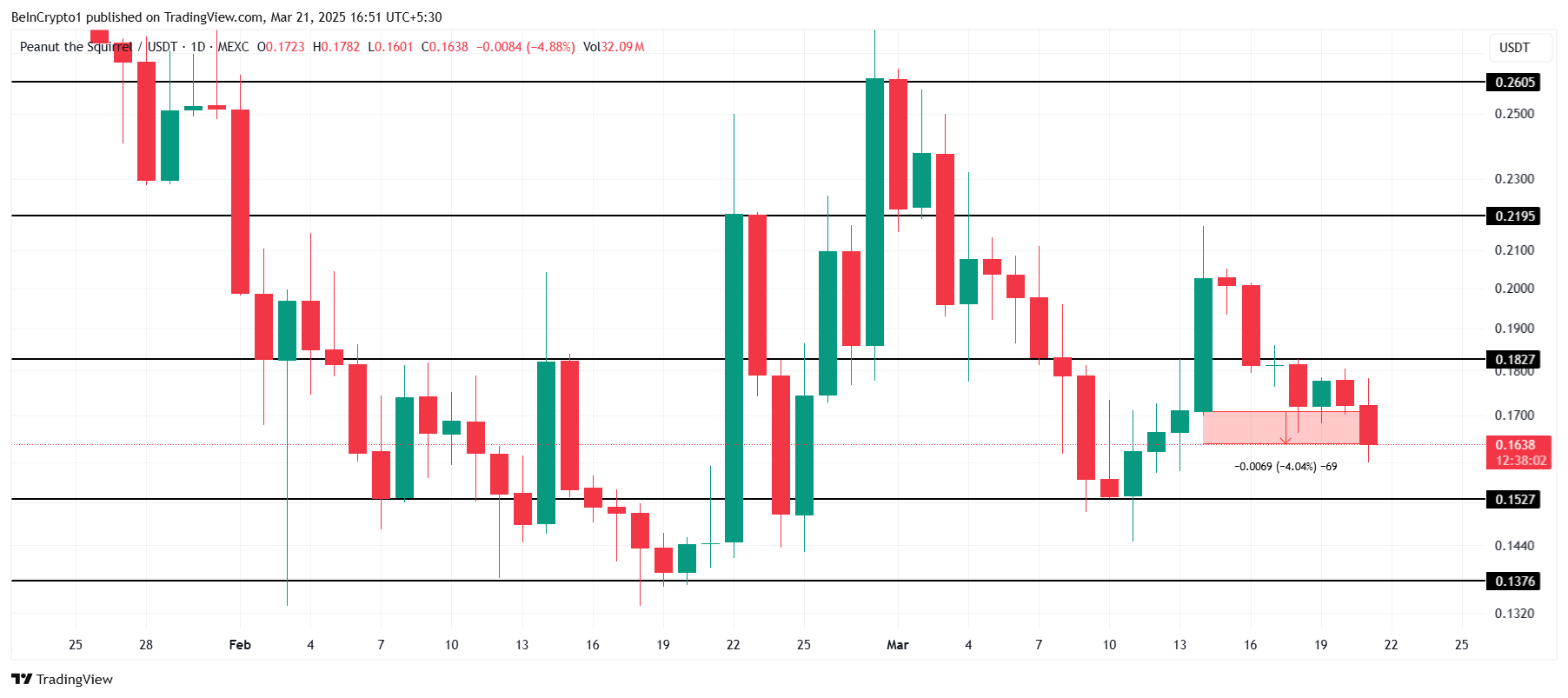 PNUT đã trải qua sự biến động giá tối thiểu, giảm 4% trong bảy ngày qua để giao dịch ở mức 0.163 USD. Không giống như nhiều altcoin khác, nó không chứng kiến sự tăng mạnh hay giảm mạnh nào. Hành động giá vẫn tương đối ổn định, phản ánh tâm lý thận trọng của thị trường đối với meme coin này.