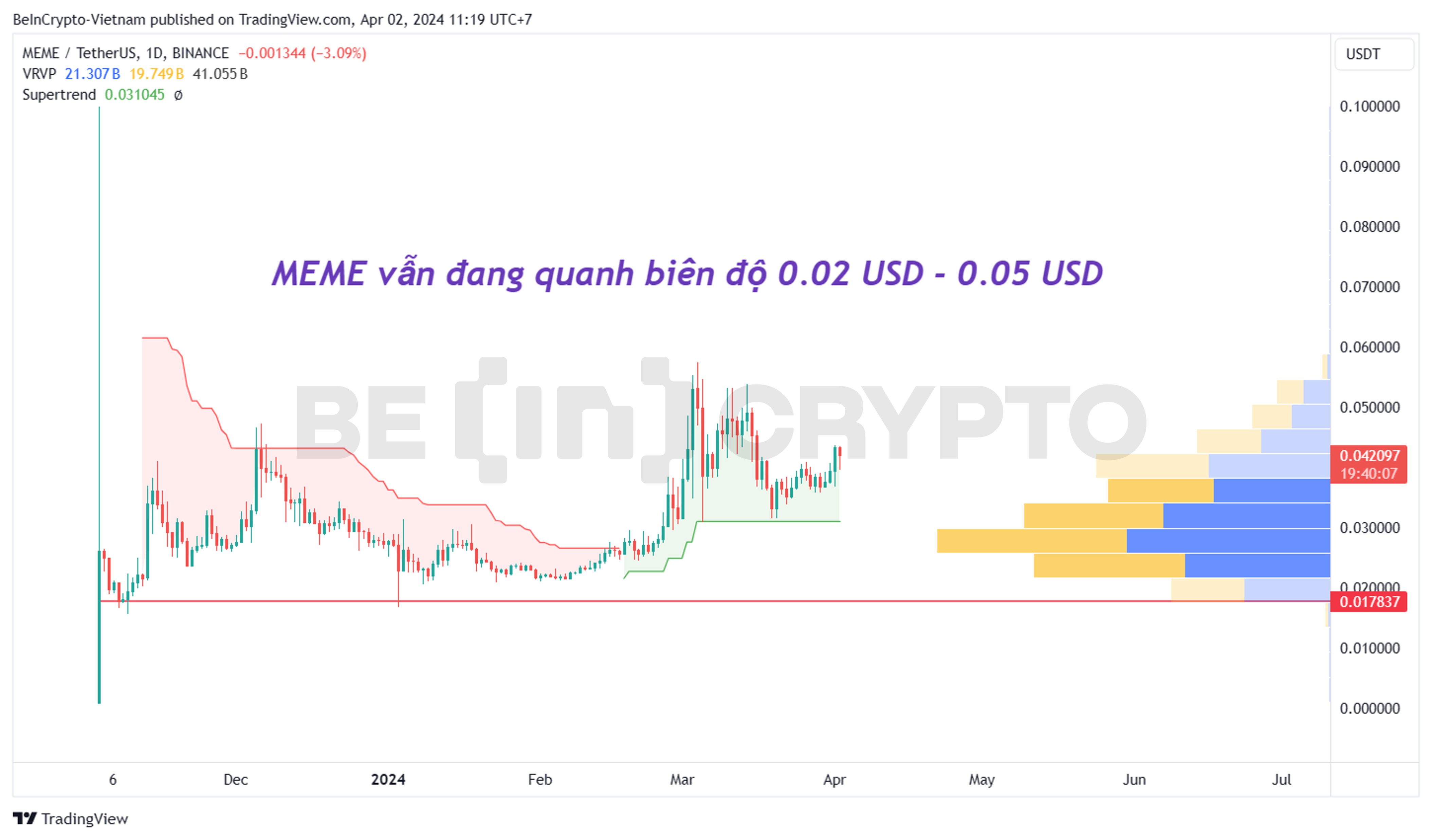 - Nhìn lại đường giá 2024, giá MEME cũng đã ghi nhận đà tăng gấp 3 lần. Tuy nhiên, mức tăng này vẫn rất khiêm tốn nếu so với biên độ tăng của những meme có cộng đồng lớn như DOGE, SHIB, BONK… Về kỹ thuật, chỉ báo Super Trend khung ngày của MEME đã chuyển xanh, và vũng hỗ trợ tốt tại 0.03 USD.