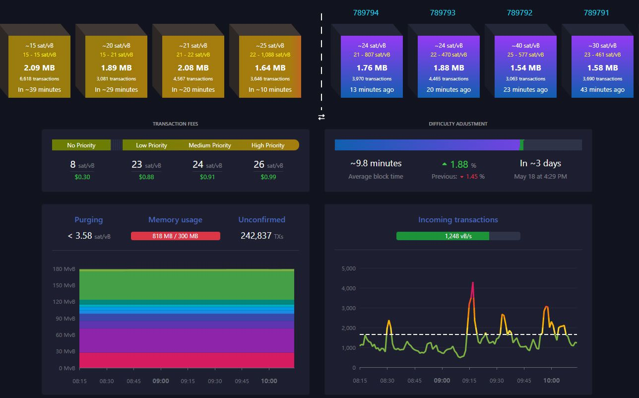 Mạng Bitcoin giờ đã tạm lắng khi cơn sốt đào memecoin đang giảm dần. Số lượng giao dịch chưa được xác nhận đang chờ xử lý trong mempool đã giảm xuống còn 242,837 giao dịch.