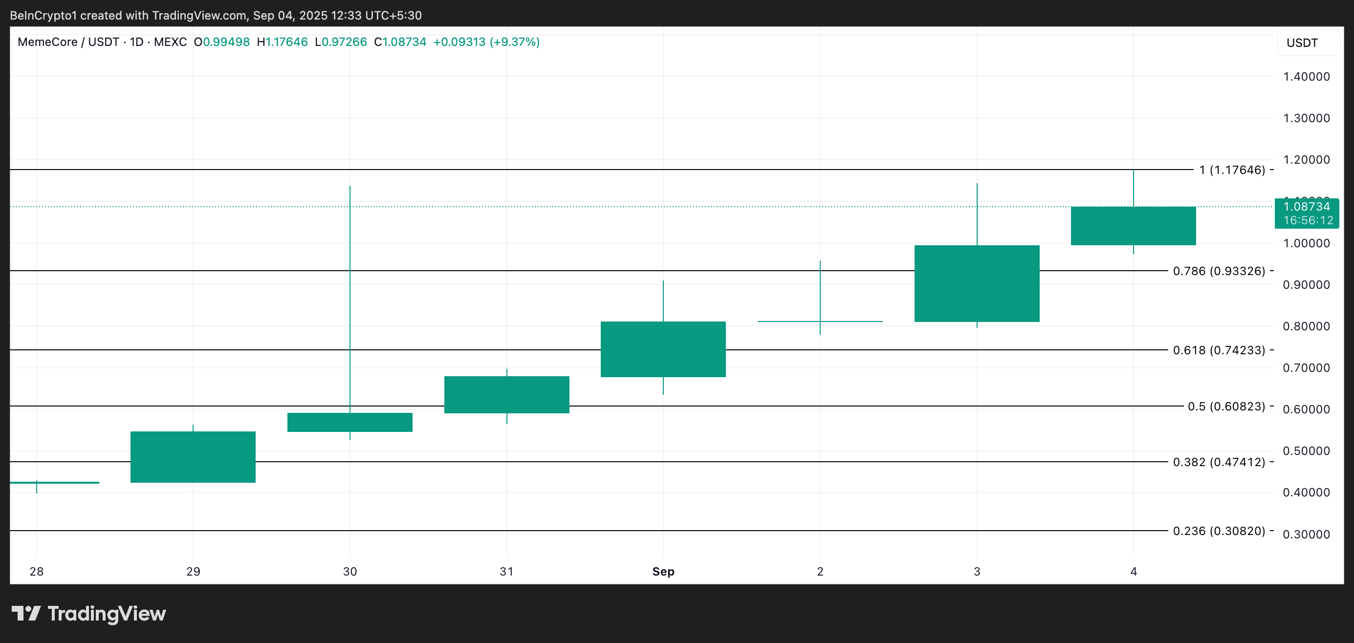 Layer-1 (L1) coin MemeCore (M) đã trở thành đồng coin tăng giá mạnh nhất hôm nay, vượt qua sự ảm đạm của thị trường trong 24 giờ qua. Giá của token này đã tăng gần 30% trong ngày, tạm thời đạt mức cao nhất mọi thời đại mới là 1.176 USD trong những giờ giao dịch đầu tiên.