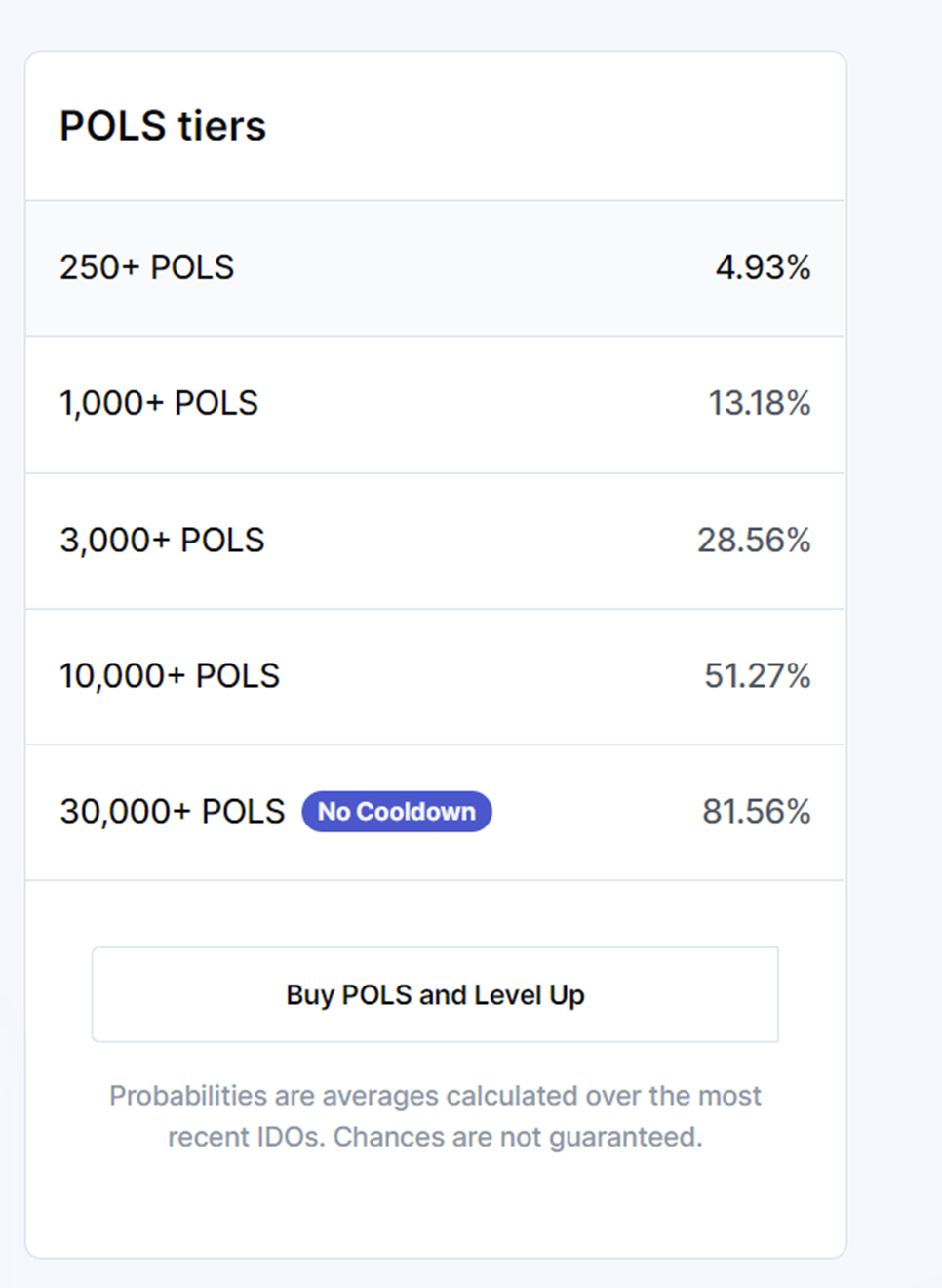 Nhiều người lầm tưởng cứ holder POLS sẽ được mua IDO. Trên thực tế, tỷ lệ trúng vé mua token tỷ lệ thuận với số lượng POLS Power. Trong đó, POLS Power có được từ việc stake POLS trong pools. Bảng tỷ lệ trúng IDO được nêu trong bảng dưới đây: