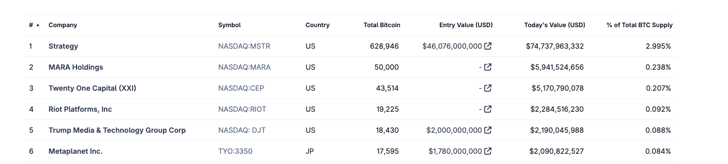 Sau lần mua hiện tại, Metaplanet vẫn duy trì vị trí là công ty nắm giữ Bitcoin công khai lớn thứ sáu. Có một khoảng cách rất nhỏ giữa Trump Media & Technology Group Corp và Metaplanet cho vị trí thứ 5.
