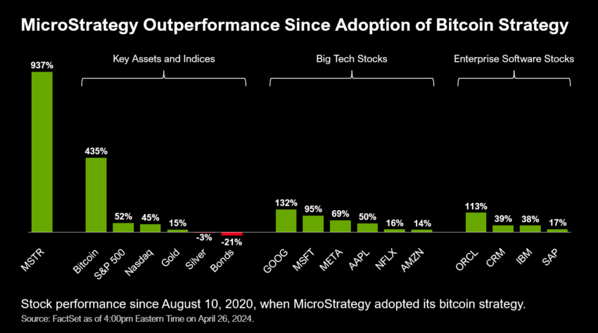 Chiến lược mua lại Bitcoin tích cực của MicroStrategy thường xuyên được nhấn mạnh bởi chủ tịch điều hành của nó, Michael Saylor. Hỗ trợ chiến lược của mình bằng dữ liệu, Saylor lưu ý rằng cổ phiếu MicroStrategy (MSTR) đã chứng kiến mức tăng trưởng giá 937% kể từ khi công ty áp dụng cách tiếp cận tập trung vào Bitcoin vào năm 2020.