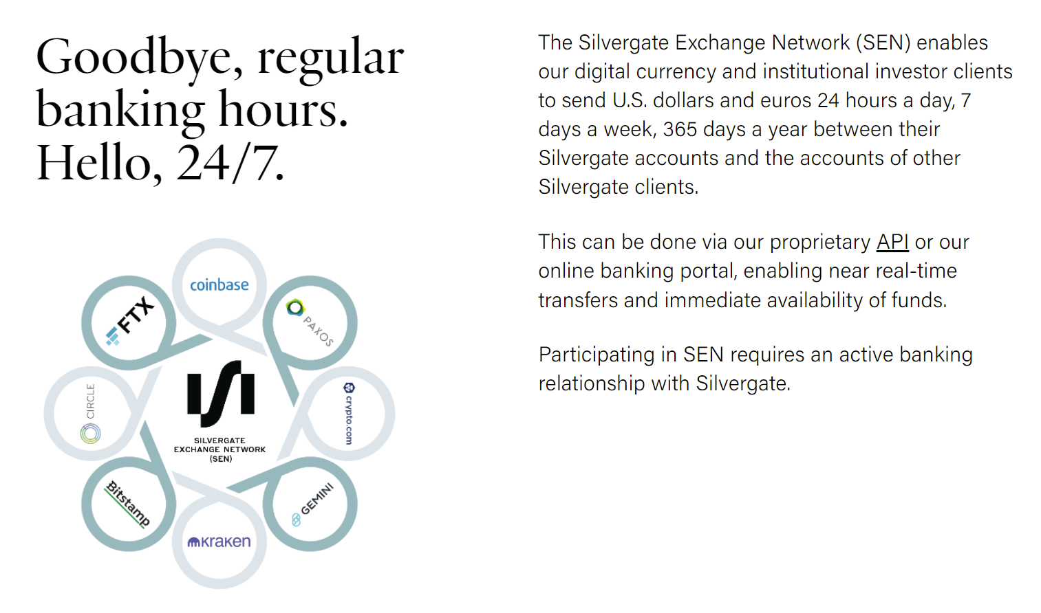 Mạng trao đổi Silvergate (SEN) của Ngân hàng Silvergate nhắm vào khách hàng là doanh nghiệp tiền điện tử. Vào tháng 8/2019, sàn giao dịch Gemini đã tham gia mạng lưới SEN để cung cấp dịch vụ chuyển khoản fiat 24/7.