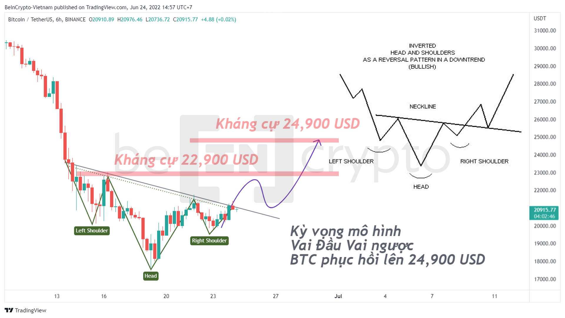 Biến động giá Bitcoin những ngày qua đang có dấu hiệu hoàn chỉnh mô hình vai đầu vai ngược. Kỳ vọng của mô hình này là giá Bitcoin có thể phục hồi lên 24,900 USD.