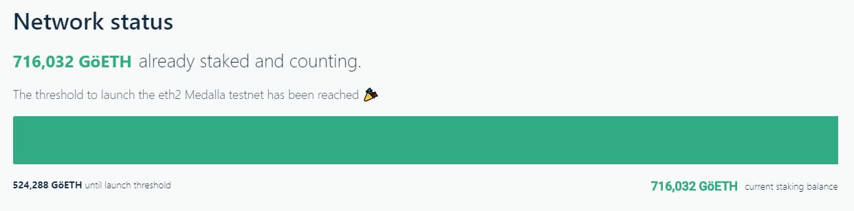 Một cổng thông tin làm nền tảng công bố mạng thử nghiệm Medalla cũng đã được phát triển để giảm bớt quá trình cho những người xác thực tiềm năng, và giúp họ tham gia và giám sát tiến trình. Hiện nay, hơn 716.000 GöETH đã được đặt cọc chuẩn bị cho việc công bố.