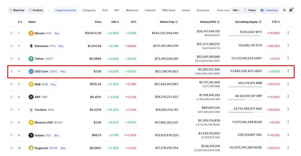Giám đốc chiến lược của Circle khẳng định USDC được hỗ trợ hoàn toàn bằng các tài sản an toàn. Hiện tại, vốn hóa thị trường của USDC là 53.6 tỷ USD, chỉ xếp sau USDT một hạng về vốn hóa. Vào đầu tháng này, USDC là tiền điện tử được mua nhiều nhất bởi 100 ví Ethereum hàng đầu.