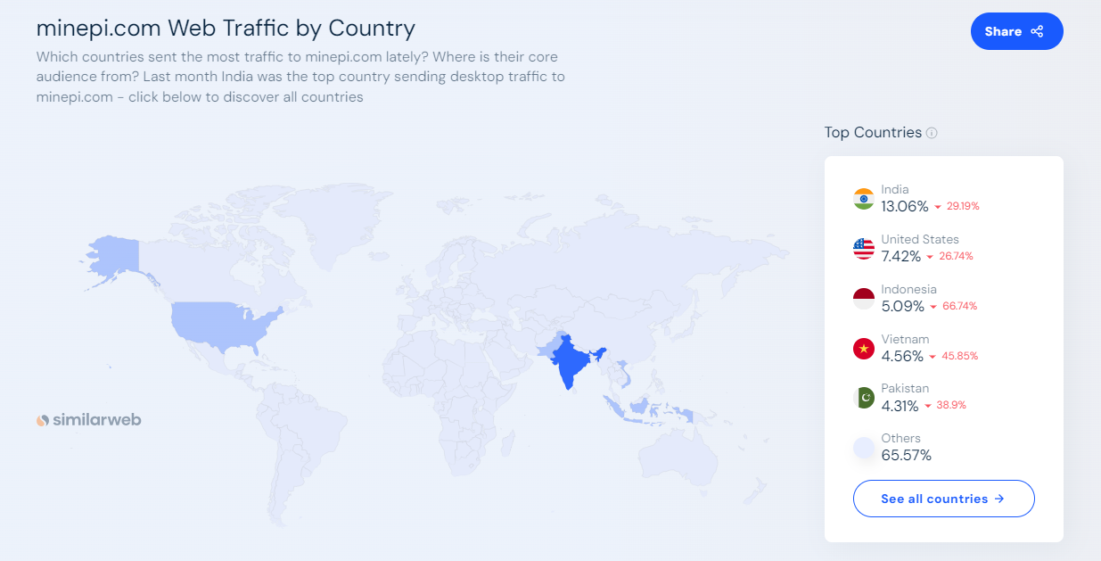 Bên cạnh một nhóm những người yêu Pi kỳ cựu, có vẻ như số đông các nhà đầu tư Việt đã và đang mất dần kiên nhẫn với sự chờ đợi trong vô vọng này. Mặc dù gần đến ngày Pi Network mainnet 28/6 nhưng lưu lượng truy cập vào website chính thức của dự án đang chứng kiến một sự sụt giảm trầm trọng, trong đó có Việt Nam.