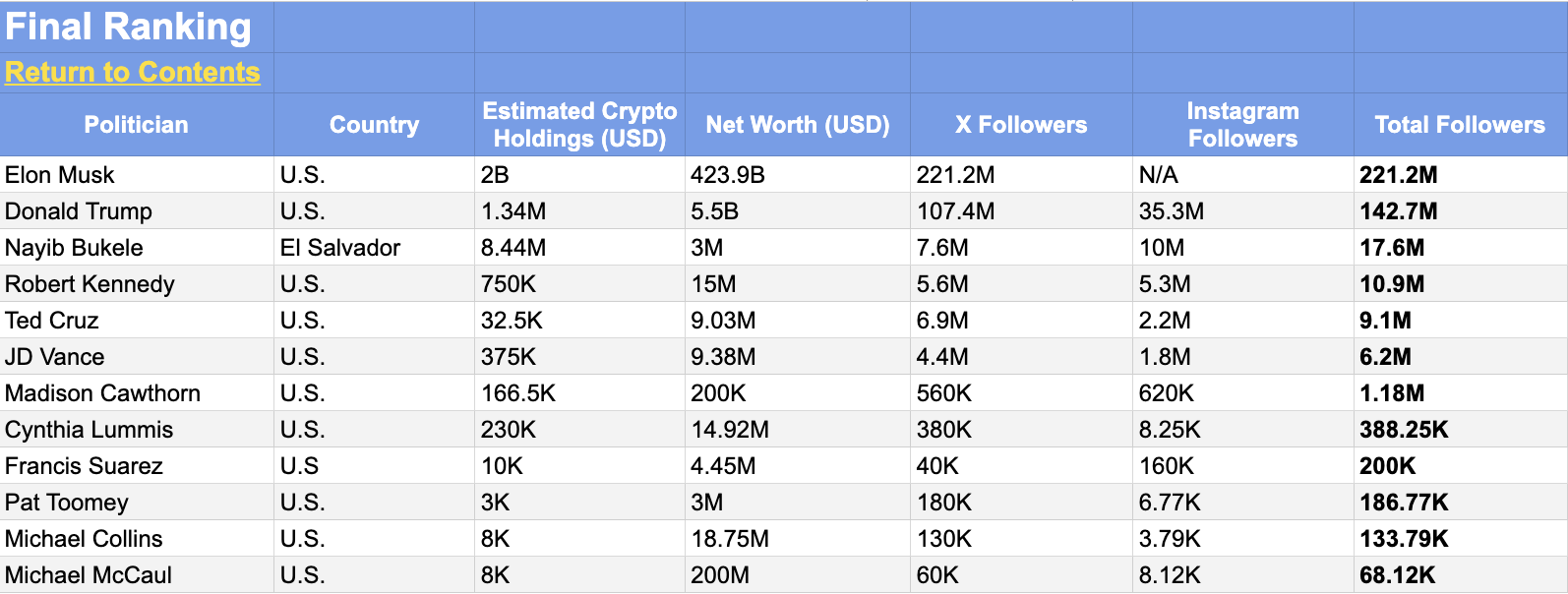 Điểm số cuối cùng được xác định bởi tổng số người theo dõi trên X và Instagram, phản ánh khả năng của mỗi nhân vật trong việc định hình ý kiến công chúng và thu hút sự chú ý đến không gian tiền điện tử.