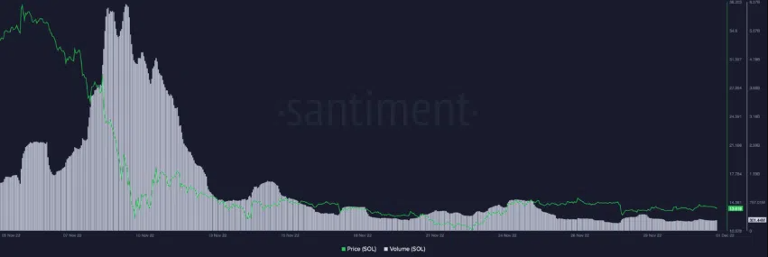 Từ mức cao nhất trong tháng 11 là 38.79 USD, giá SOL đã giảm thêm 65% và hiện đang giao dịch ở mức 13.5 USD tại thời điểm BeInCrypto thực hiện bài viết này. Tồi tệ hơn là khối lượng giao dịch hàng ngày đã giảm 25% so với ngày hôm trước, đạt khoảng 220 triệu USD vào thời điểm viết bài. Khối lượng giao dịch đối với SOL đã bị ảnh hưởng lớn kể từ sự sụp đổ của FTX.