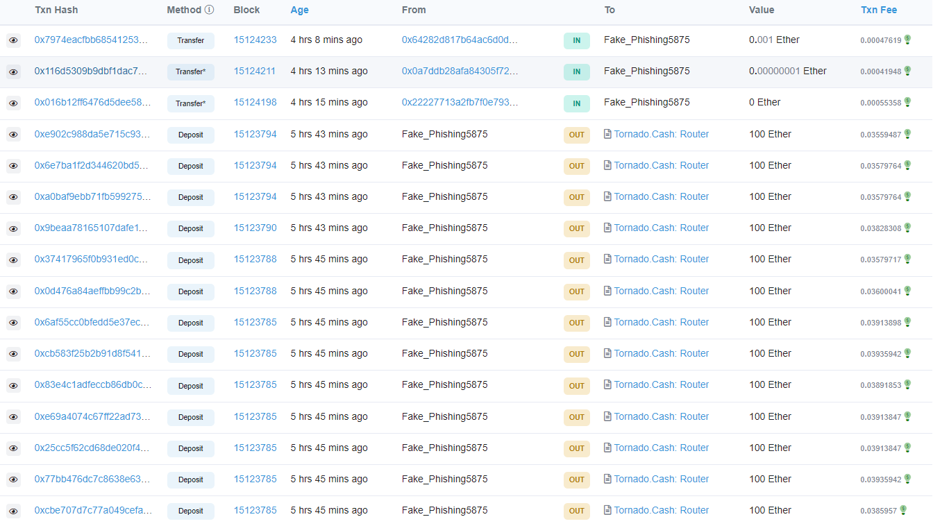 Tính đến thời điểm BeInCrypto viết bài này, địa chỉ trong thông tin cảnh báo từ CZ đã được gắn nhãn Phish/Hack (Fake_Phishing5875) trên Etherscan. Nhiều khả năng hacker đã lợi dụng hình thức phishing attack để tấn công giao thức. Các giao dịch này được chia nhỏ (khoảng 100 ETH) để tiến hành rửa thông qua Tornado Cash. Tại thời điểm viết bài, địa chỉ ví này hiện nắm giữ khoảng 70 ETH, tương đương với số tiền khoảng 77,337 USD.