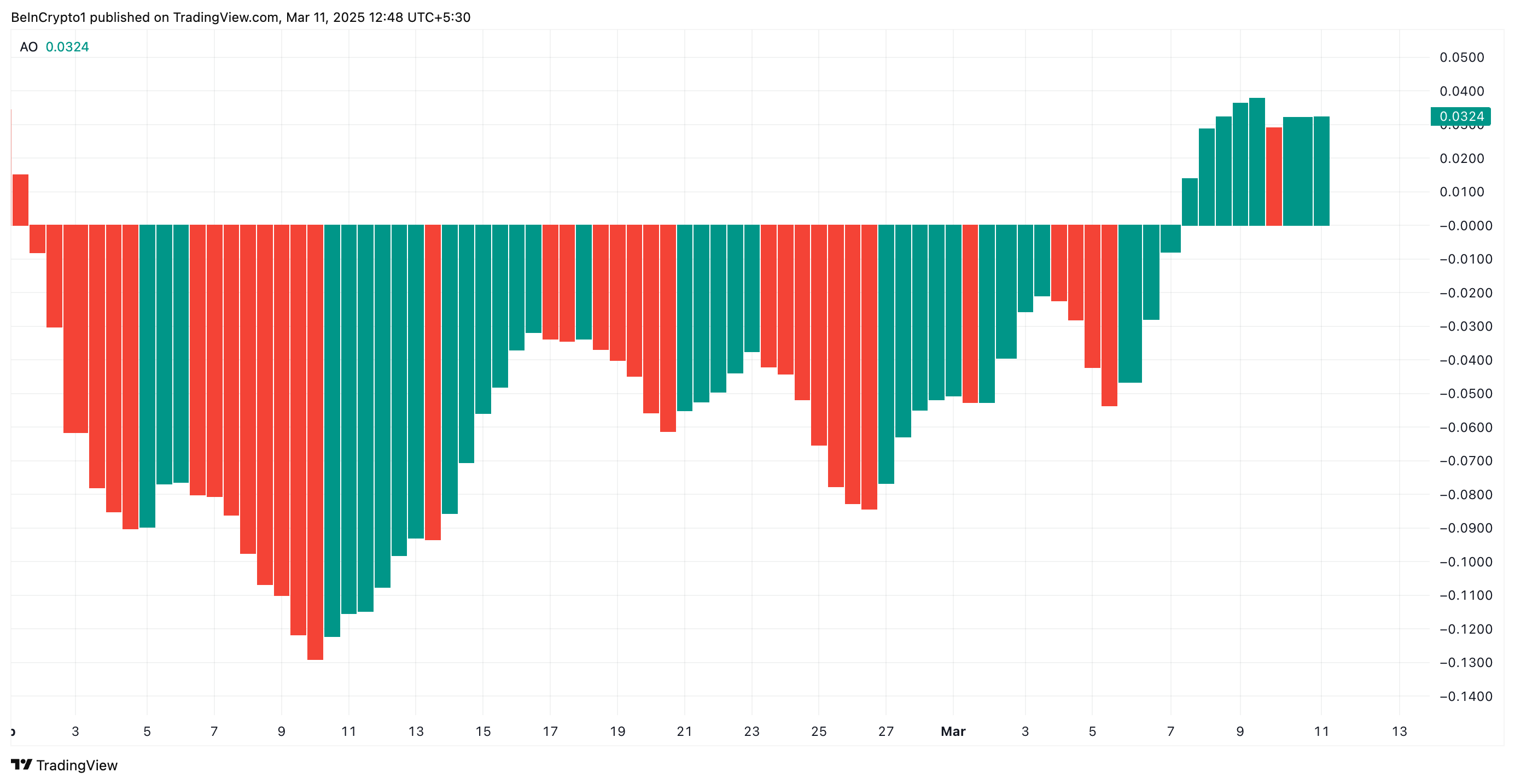 Hơn nữa, trên biểu đồ một ngày của MOVE/USD, các chỉ số từ Awesome Oscillator (AO) của altcoin này ủng hộ triển vọng tăng giá. Tại thời điểm viết bài, chỉ báo này, đo lường động lực thị trường của một tài sản, đang hiển thị các thanh biểu đồ màu xanh lá cây.