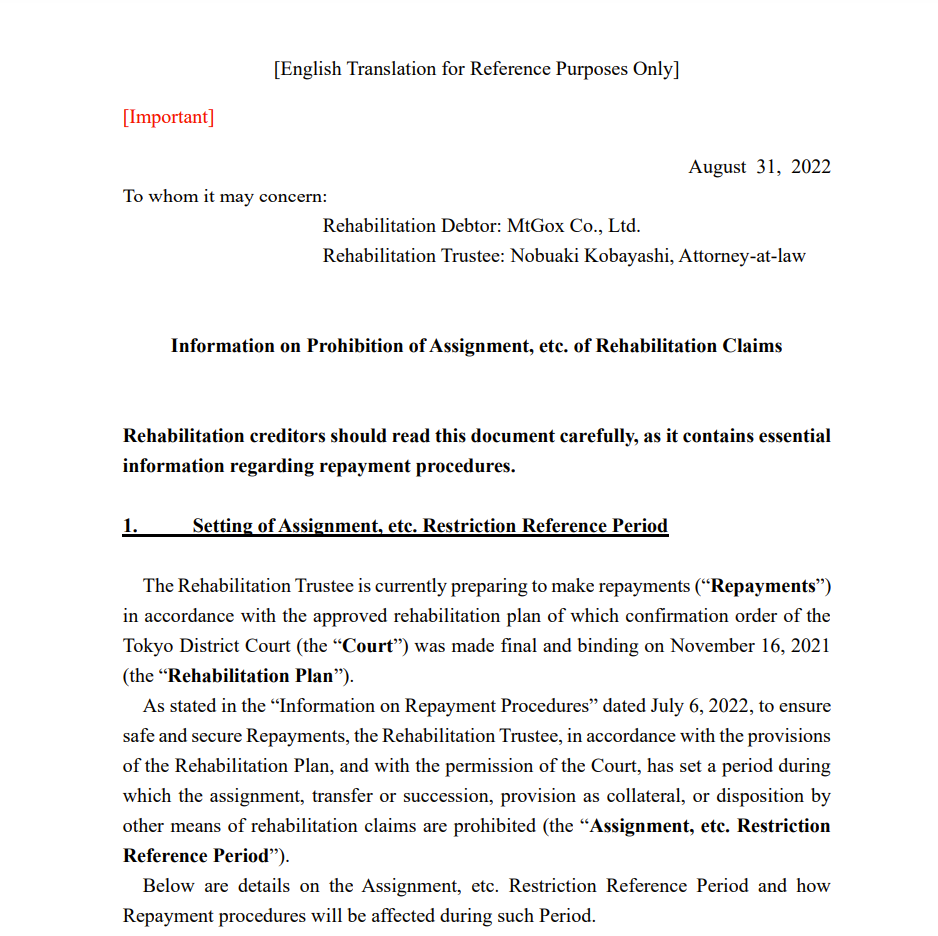 Trong thời giam tham chiếu trước ngày 15/9, Mt. Gox ngừng nhận các yêu cầu “chuyển nhượng hoặc kế thừa, cung cấp tài sản thế chấp, hoặc định đoạt bằng các biện pháp phục hồi khác”. Ngoài ra, nếu nạn nhân gửi thông báo chuyển yêu cầu phục hồi nợ cho người được ủy thác phục hồi trong thời gian này, điều này sẽ gây ảnh hưởng để kế hoạch hoàn trả. Do đó, người được ủy thác không thể truy cập hoặc chọn tùy chọn trả nợ.