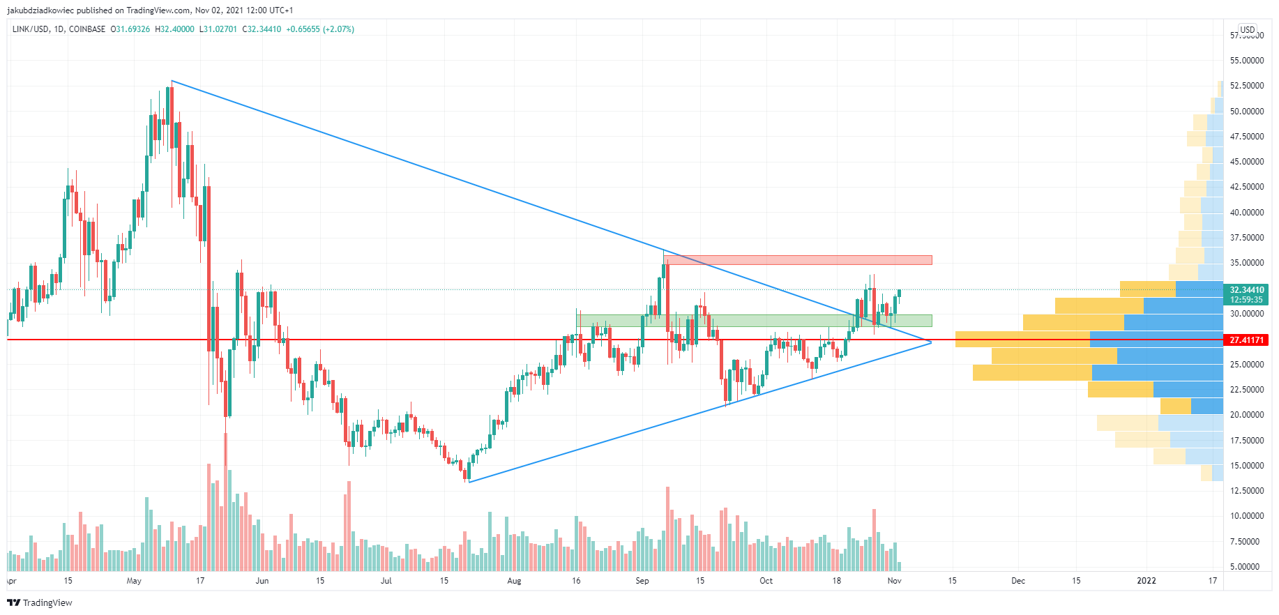 Ví dụ: LINK đã bứt phá trên vùng kháng cự trong phạm vi 29 – 30 USD và đồng thời đóng cửa trên đường kháng cự giảm dài hạn (màu xanh lam). Khi các mức này được xác nhận là hỗ trợ, thì LINK đã sẵn sàng để tiếp tục xu hướng tăng và cố gắng vượt qua vùng kháng cự quan trọng ở mức 35 USD. Nếu thành công, LINK sẽ không có nhiều mức kháng cự trước ATH ở mức 53 USD.