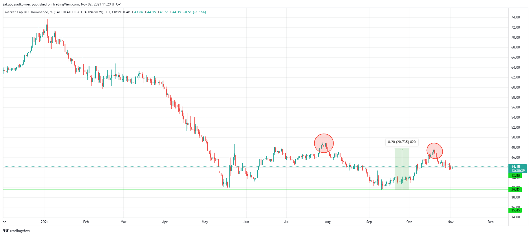 Hơn nữa, BTCD đã không thể hình thành mức cao hơn so với mức 49% đạt được vào ngày 30 tháng 7 năm 2021 (vòng tròn màu đỏ). Đây là một tín hiệu giảm giá có thể cho thấy sự tiếp tục suy giảm trong sự thống trị của Bitcoin mà sự suy giảm này đã bắt đầu kể từ đầu năm 2021. Hỗ trợ dài hạn được tìm thấy ở các mức 39.5% và 35.5%.