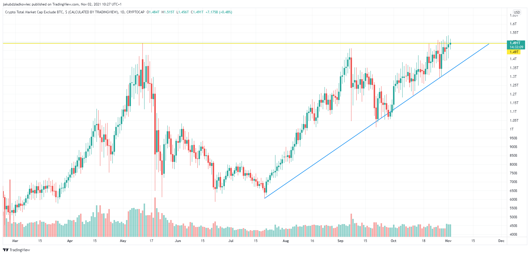 Biểu đồ tổng vốn hóa thị trường Altcoin (TOTAL2) đang trên đà tiến về mức đỉnh cũ tại 1.49 nghìn tỷ USD, được thiết lập vào ngày 12 tháng 5 năm 2021 (đường màu vàng). Vào ngày 7 tháng 9, tổng vốn hoá thị trường Altcoin đã gần quay về lại được mức đỉnh này nhưng không thành công. Thay vào đó, giá trị vốn hoá thị trường Altcoin lại quay về đường hỗ trợ tăng (màu xanh lam) được tạo từ giá trị vốn hoá thấp nhất tại 608 tỷ USD vào ngày 20 tháng 7.