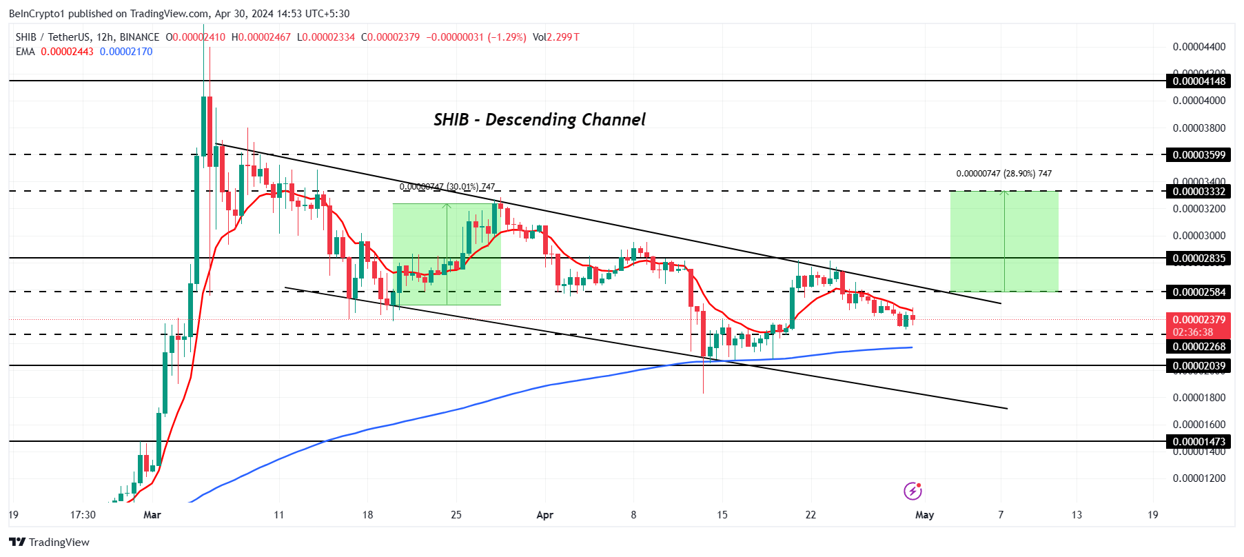 Giá của Shiba Inu đã di chuyển trong kênh giảm dần, nhưng với sự hỗ trợ của đường EMA 50 và 200 ngày, một sự bứt phá tăng giá có thể xảy ra trong những ngày tới. Một sự đột phá trên đường xu hướng trên ở mức 0.00002584 USD có thể chuyển thành tăng trưởng 29% cho meme coin này, có khả năng đẩy nó đến 0.00003332 USD.