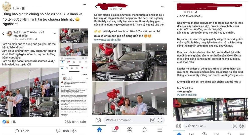- Đội ngũ của Myaladdinz biết tạo “phông bạt”, dựng lên viễn cảnh giả tạo như mua nhà mua xe (thực chất chỉ là thuê hoặc chụp hình) khiến nhiều người hoa mắt. Đánh vào lòng tham của con người.
