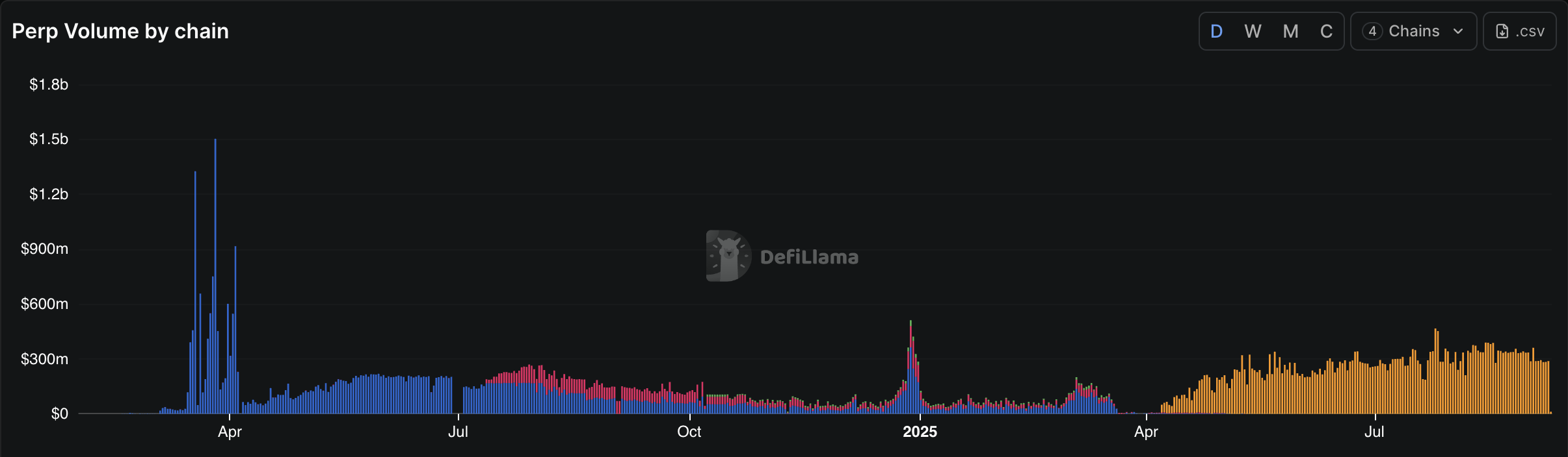 Điều này một lần nữa thu hút nhiều sự chú ý. Dữ liệu khối lượng hợp đồng tương lai vĩnh viễn (Perp) từ DefiLlama cho thấy sự thay đổi đáng kể trong hoạt động giao dịch của MYX.