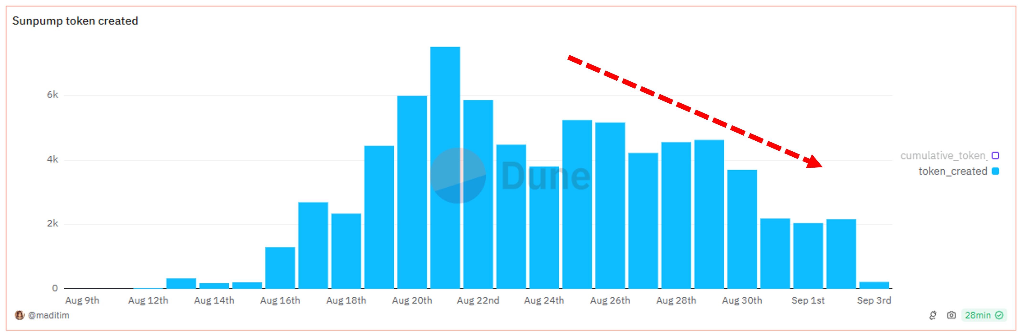 Sunpump là nền tảng ra đời sau, chỉ mới khởi động trong tháng 8, và cũng tạo được cơn sốt nhất định trong cộng đồng. Nhưng dữ liệu cho thấy số lượng token được tạo mới trên Sunpump theo ngày đã giảm mạnh, từ mức cao hơn 7,500 token/ngày về chỉ còn hơn 2,000 token/ngày. Theo đó, doanh thu nền tảng theo ngày cũng giảm từ 3.6 triệu TRX về còn 665,000 TRX.