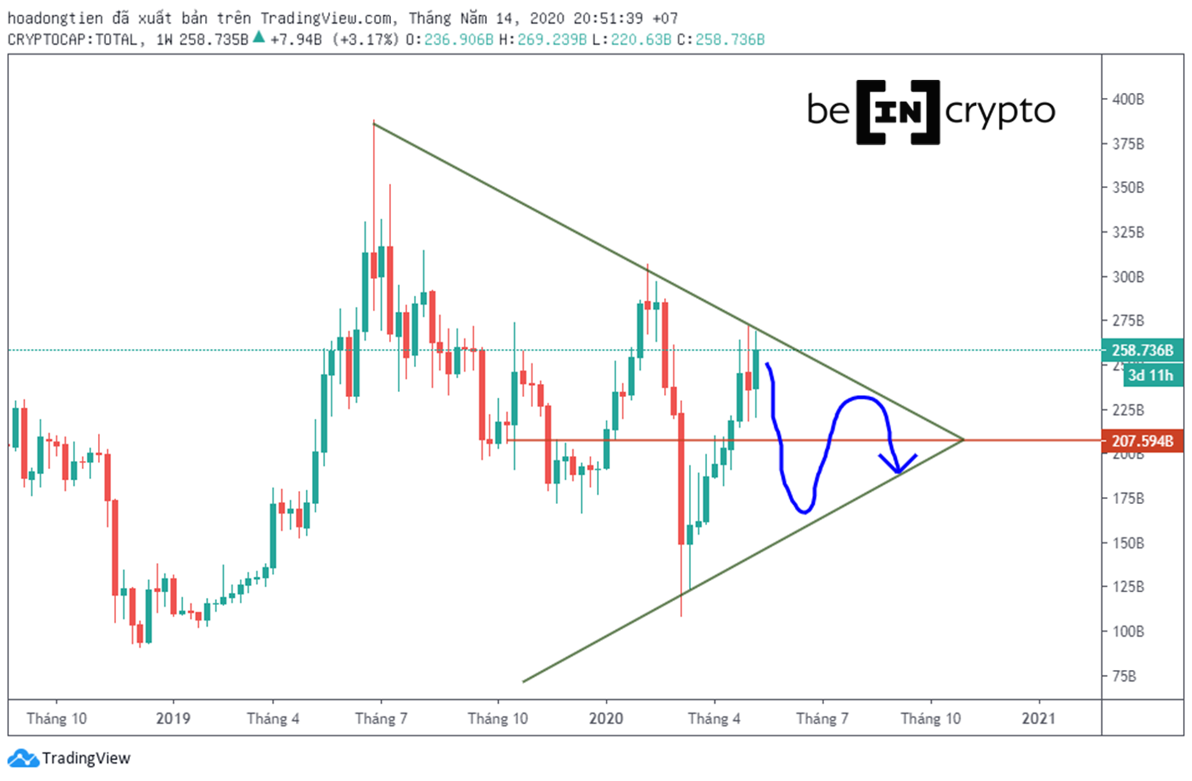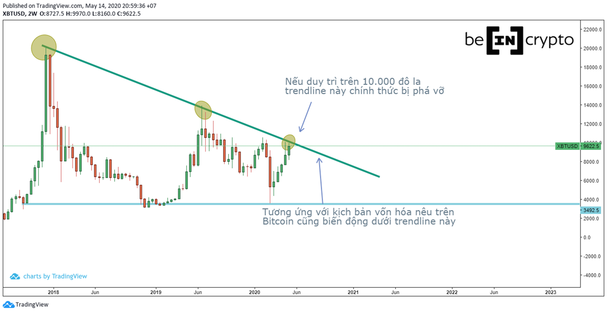 Có một trendline lớn kéo từ giá 20.000 đô cho đến 14.000 đô, giữ biến động trong một giới hạn nhất định. Giới hạn đang hẹp dần theo từng tháng. Việc Bitcoin vượt 10.000 đô la lúc này, thì tại ngay 10.000 đó sẽ trở thành mức trung bình mới.