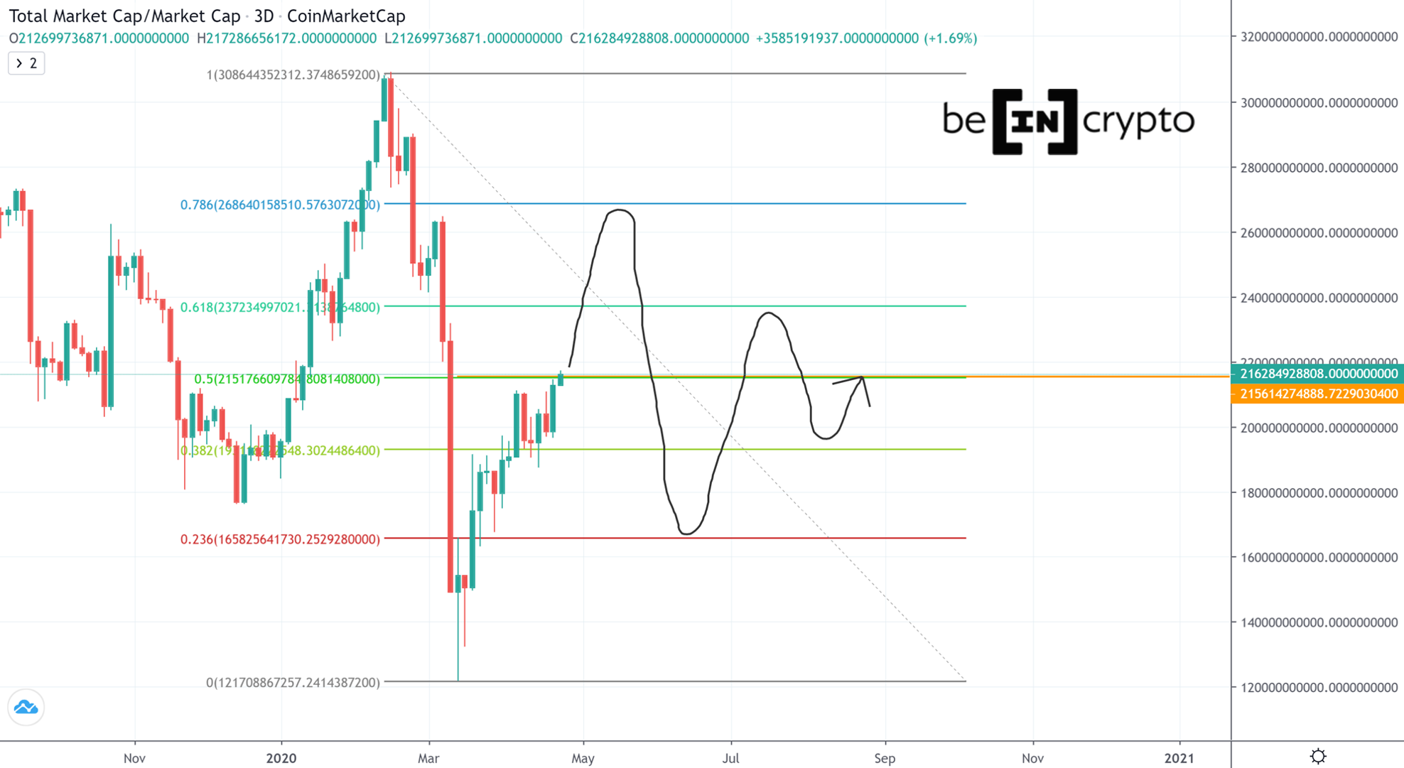 Thật khó xác định, giữa con số tổng vốn hóa thị trường và giá Bitcoin thì cái nào chi phối cái nào. Thông thường, khi thị trường có dòng tiền mới đổ vào, thì giá Bitcoin sẽ chi phối vốn hóa, vì lúc đó Bitcoin là nguyên do của sự thu hút dòng vốn. Nhưng khi không có nhà đầu tư mới, thì những biến động chỉ mang ảnh hưởng nội bộ, lúc đó đồ thị vốn hóa sẽ cần được xem xét trước.