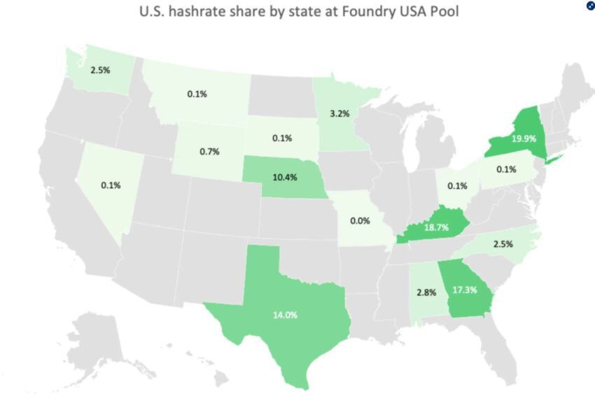 Hoa Kỳ thống trị hoạt động khai thác Bitcoin trên toàn cầu với 35.4% thị phần hashrate trung bình hàng tháng tính đến tháng 8 năm ngoái. Theo một báo cáo của CNBC, tại Hoa Kỳ, 19.9% hashrate của Bitcoin là ở New York. Sau New York, 18.7% đến từ Kentucky, tiếp theo là 17.3% ở Georgia và 14% ở Texas.