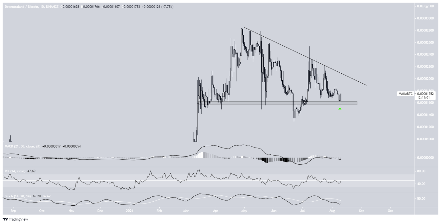 Sau khi cặp tỷ giá này bị từ chối bởi một đường kháng cự giảm dần, nó quay trở lại vùng 1600 satoshi một lần nữa, xác nhận đây là vùng hỗ trợ. MANA hiện đã bắt đầu bật lên về phía đường kháng cự, ở mức 2000 satoshi.