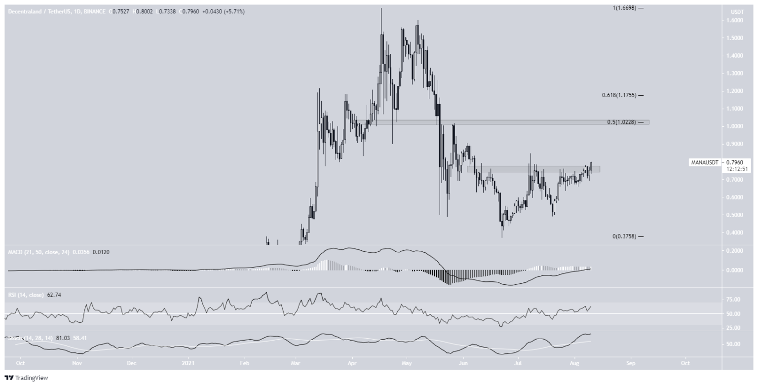 SponsoredVào ngày 10 tháng 8, MANA đã cố gắng thoát ra khỏi khu vực $0.76, mặc dù nó vẫn chưa đạt được mức đóng cửa cao hơn nó. Tuy nhiên, các chỉ báo kỹ thuật đều hỗ trợ cho đà tăng tới vùng kháng cự tiếp theo ở mức $1.02.