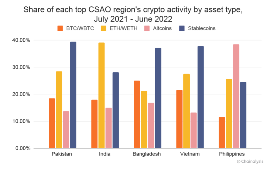 Theo báo cáo của Chainalysis, CSAO là viết tắt của khu vực Trung Á, Nam Á, Đông Nam Á và Châu Đại Dương. Mở đầu báo cáo, Chainalysis nhận xét “CSAO là thị trường tiền điện tử lớn thứ 3 trong chỉ số của chúng tôi năm nay. Dòng tiền tại các quốc gia này lên đến 932 tỷ USD từ tháng 7/2021 đến tháng 6/2022. Trong đó, Ấn Độ dẫn đầu nhóm với hơn 172 tỷ USD. Các vị trí sau lần lượt là Thái Lan, Việt Nam, Australia và Singapore với dòng tiền trên 100 tỷ USD.”
