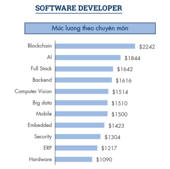 SponsoredTheo báo cáo của Topdev – một đơn vị chuyên tuyển dụng trong lĩnh vực công nghệ thông tin, nhóm lập trình viên blockchain ở Việt Nam cực kỳ khan hiếm, chỉ chiếm 3% – 5% thị trường. Theo một chia sẻ từ Navigos Search “Mức lương trả cho ứng viên người Việt và người nước ngoài tương đương nhau, khoảng từ 2.000 – 3.000 USD/tháng (tương đương 45 – 70 triệu đồng) nhưng rất khó tuyển người. Do khan hiếm kỹ sư IT người Việt trong lĩnh vực này, nhiều doanh nghiệp nước ngoài phải tuyển các chuyên gia từ nước ngoài”. Ngoài ra, mức lương trả cho lập trình viên Blockchain và AI đang được các nhà tuyển dụng đánh giá ở mức cao nhất: