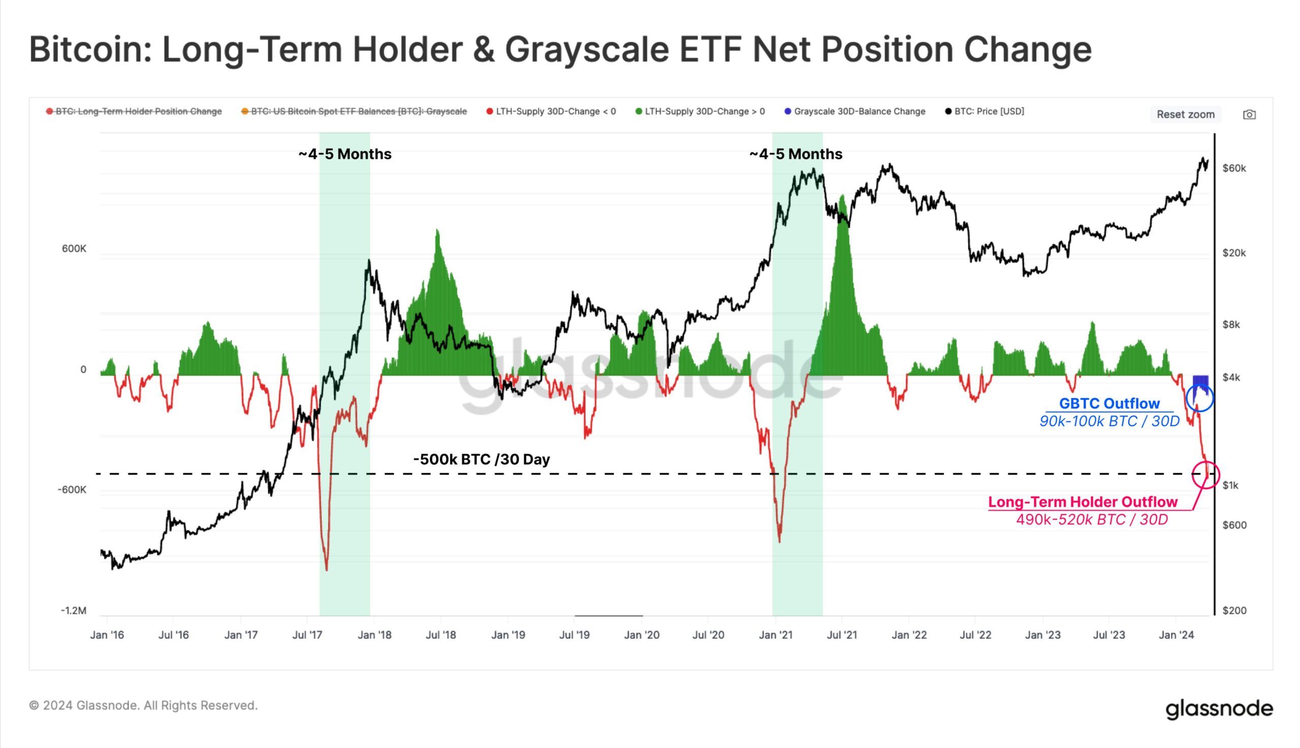 - Có thể nhanh chóng nhận thấy, các Holder dài hạn đã liên tục Outflow từ cuối năm 2023 cho đến nay. Glassnode tính toán, trung bình holder dài dại đã outflow khoảng 490,000 – 520,000 BTC mỗi tháng, trong đó Grayscale đã outflow khoảng 90,000 – 100,000 BTC mỗi tháng. Rất có thể, bên trong dòng outflow là các holder lâu năm bán BTC cho những quỹ ETF mới thành lập.