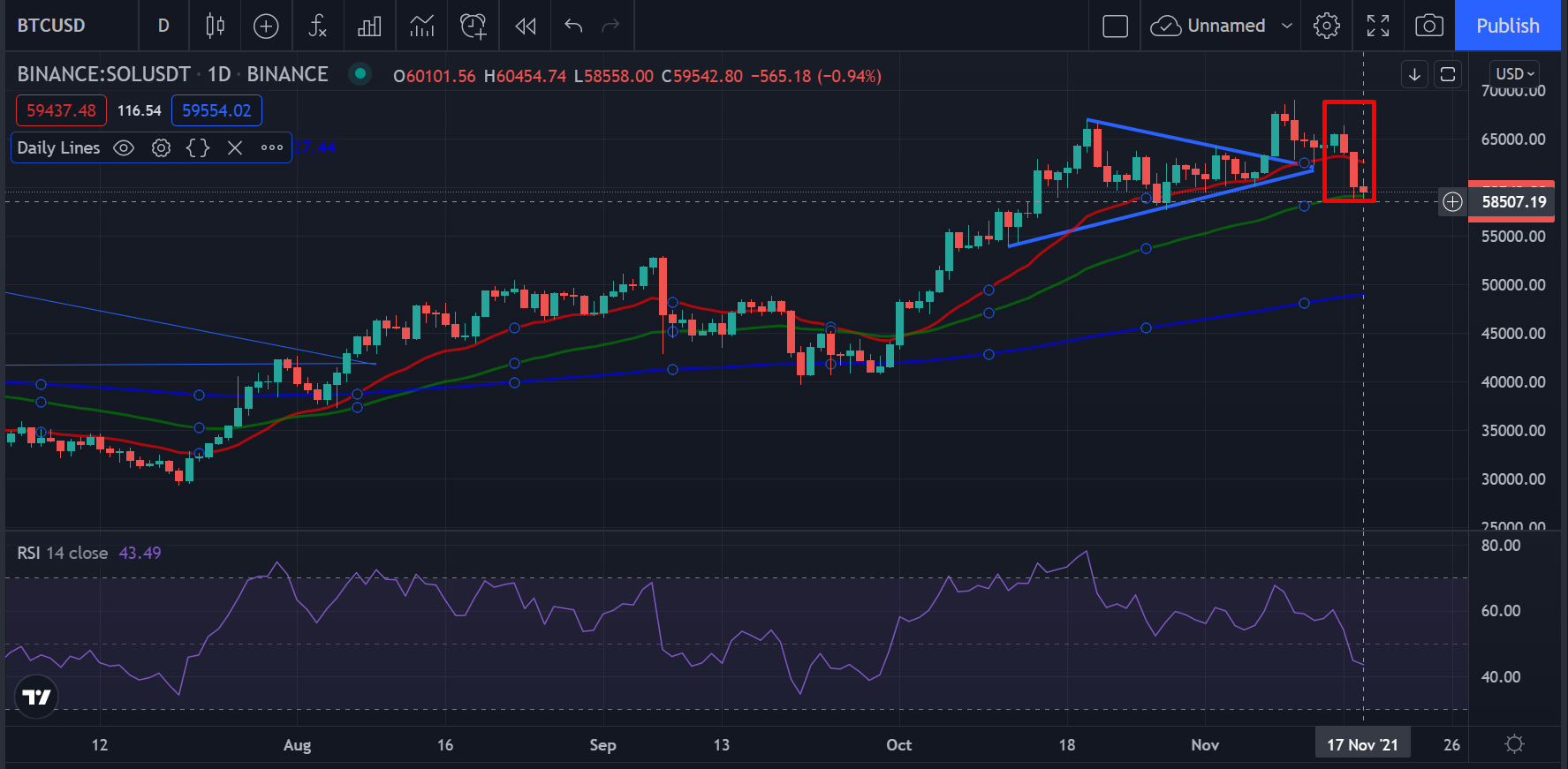 Vào ngày 15/11, nến ngày chìm có thân bao trùm nến tăng trước đó cho tín hiệu giảm ngắn hạn. Hôm nay, chỉ báo RSI cho thông số dưới 50 thể hiện tâm lý bán. Tại thời điểm viết bài, giá Bitcoin đã phục hồi ở mức 60,446 USD.