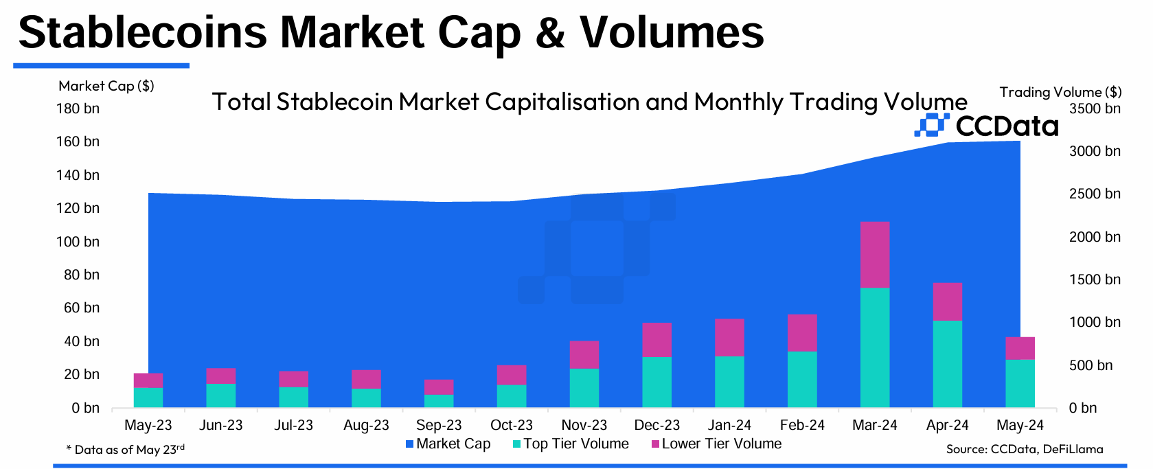 - CCData cho biết, trong tháng 5, vốn hóa của Tether (USDT) đã tăng gần 1% và đạt 111 tỷ USD. Tether trở thành đóng góp lớn đưa tổng vốn hóa stablecoin trong tháng 5 đạt 161 tỷ USD, tức tăng 0.63% trong tháng. Đây cũng là mức vốn hóa stablecoin cao nhất kể từ tháng 4/2022.