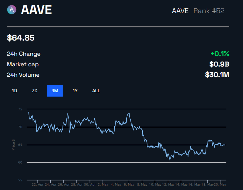 Bất chấp những lo ngại liên quan đến lỗi kỹ thuật, tin tức đã có tác động tối thiểu đến hiệu suất giá của AAVE. Mã thông báo tăng 0.1% trong 24 giờ qua, giao dịch với giá 64.85 USD vào thời điểm viết bài, theo dữ liệu của BeInCrypto.
