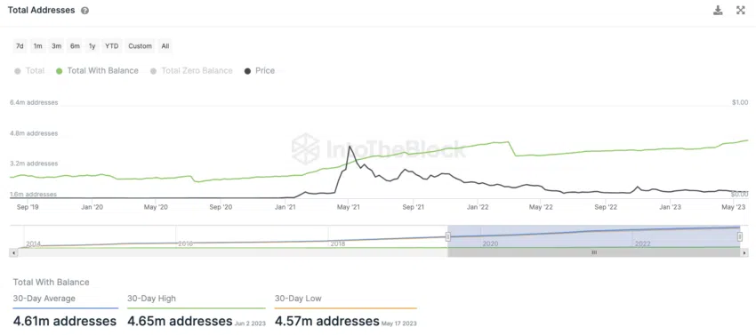 Bên cạnh chỉ số Sentiment, số lượng địa chỉ Dogecoin tiếp tục tăng, cho thấy xu hướng tăng bền vững trong việc chấp nhận và thể hiện sự quan tâm của người dùng.