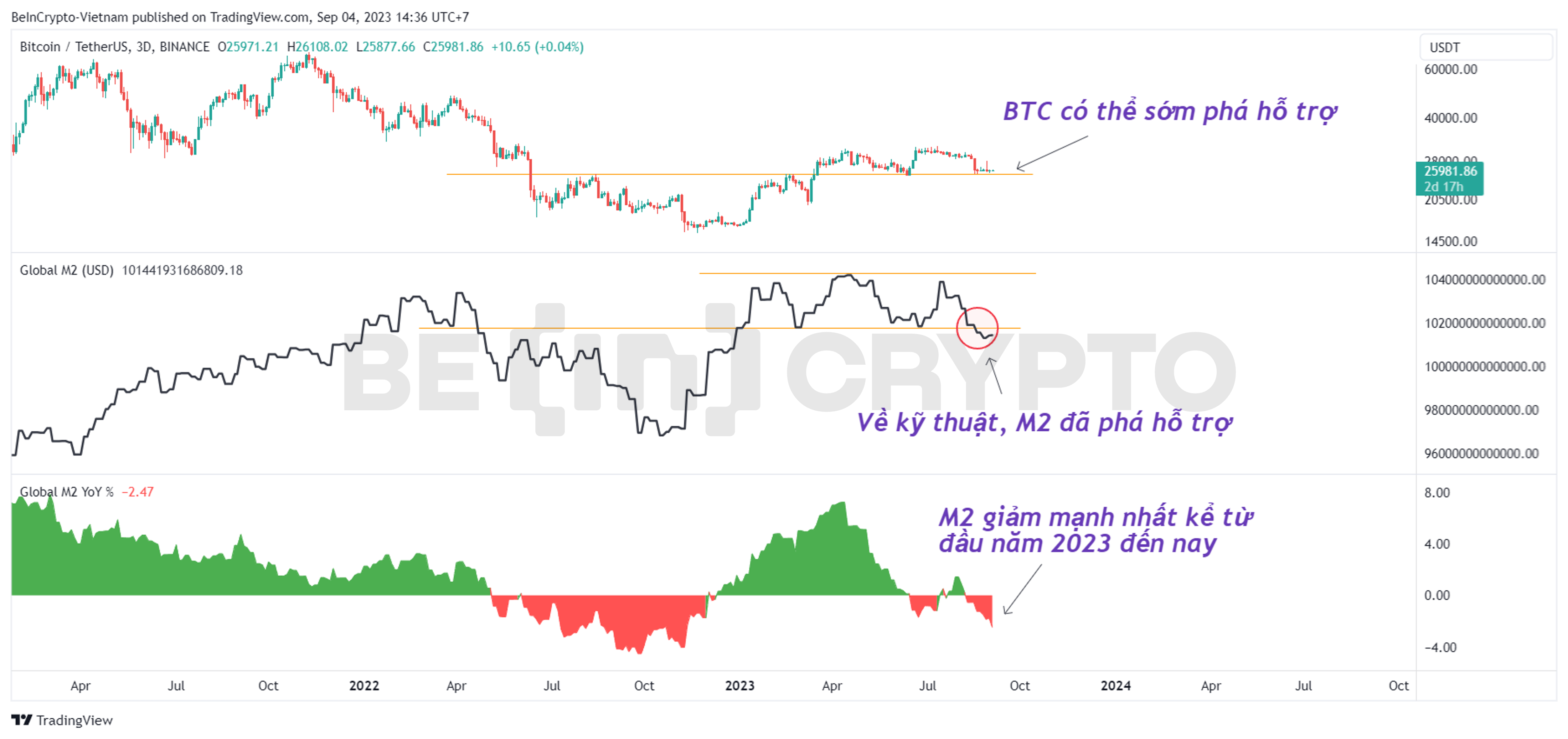 Nếu tín hiệu này xảy ra, giá BTC sẽ tiếp tục giảm sâu cùng với nguồn cung M2. Những yếu tố vĩ mô nhìn chung sẽ thường có tác động mạnh và dài hạn hơn những tín tức nội bộ thị trường.