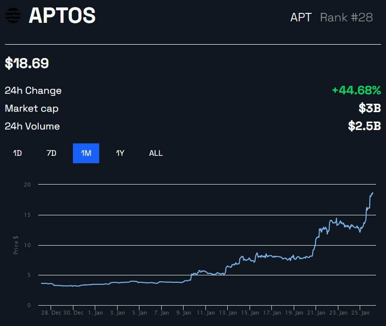 Giá APT đã tăng 46.8% trong 24 giờ qua, đẩy nó lên mức ATH mới là 18.83 USD vào buổi sáng ngày 26/1. Kể từ ngày 09/1, giá APT đã đạt mức tăng trưởng ấn tượng 372% và đã ghi nhận mức tăng hơn 400% trong tháng qua.