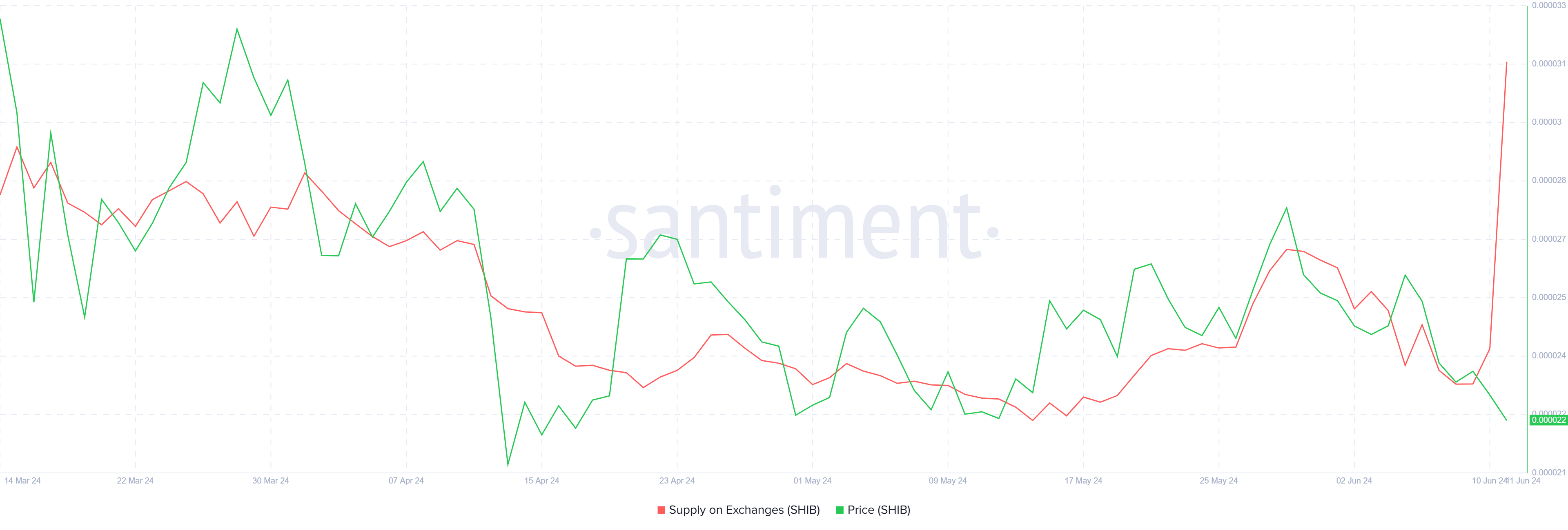Giá của Shiba Inu có thể giảm trong những ngày tới khi các nhà đầu tư tiếp tục bán ra. Tổng nguồn cung trên sàn giao dịch đã tăng vọt, đạt mức cao nhất trong 6 tháng. Trong 48 giờ qua, số lượng ví trên tất cả các sàn giao dịch đã tăng hơn 4.66 nghìn tỷ SHIB. Lượng cung trị giá 103 triệu USD này đã được các nhà đầu tư bán ra để bảo toàn những lợi nhuận họ đã tích lũy được trước đó. Việc bán ra này cũng có thể là kết quả của việc các nhà đầu tư cố gắng giảm thiểu thua lỗ của họ.