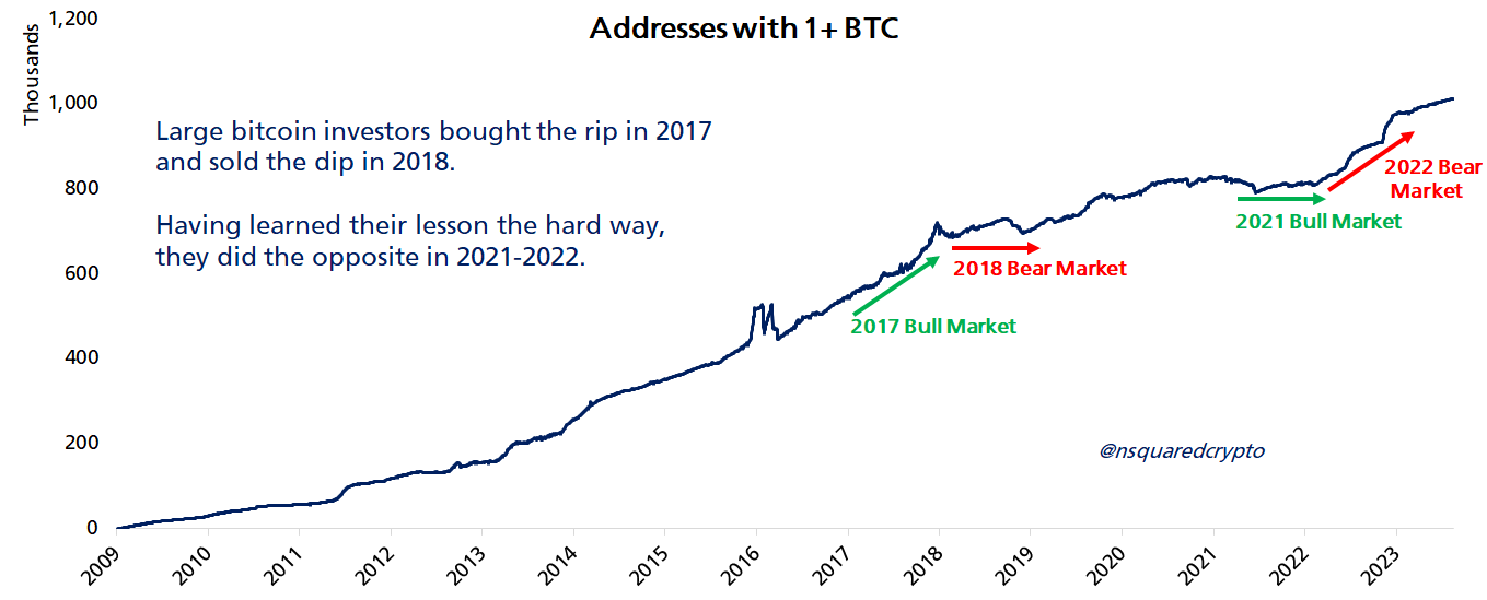 Chính thái độ rút kinh nghiệm này đã khiến cho lượng địa chỉ ví có số dư 1BTC gần đây đạt trên 1 triệu, mức cao nhất lịch sử. Điều đáng nói của năm 2022 trở đi là giá BTC đã là 5 con số, nghĩa là sự tham gia của những nhà đầu tư tổ chức là đáng kể hơn những nhà đầu tư nhỏ lẻ.
