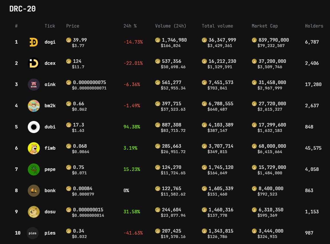 - Đã có một vài token DRC-20 tăng mạnh, điều này khiến cho nhà đầu tư tin rằng có khả năng các token này sẽ được các CEX chú ý và niêm yết. Ví dụ, Gate.io đã niêm yết DOGI và hiện trở thành token có khối lượng 24h hàng đầu hệ DRC-20, hơn 1.7 triệu USD. Và nhà đầu tư tin rằng các token khác như bm2k, dcex, fiwb… cũng có thể sẽ tăng mạnh thời gian tới.