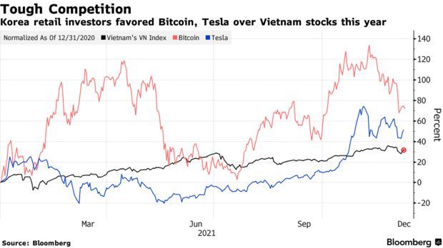 Theo Bloomberg, các nhà đầu tư cá nhân Hàn Quốc đã rút khỏi thị trường chứng khoán Việt Nam, thay vào đó, họ đổ vốn vào tiền điện tử và cổ phiếu công nghệ. Dữ liệu từ Cơ quan Lưu ký Chứng khoán Hàn Quốc cho thấy giá trị vốn đổ vào thị trường chứng khoán Việt Nam trong năm nay lên tới 166 triệu USD.