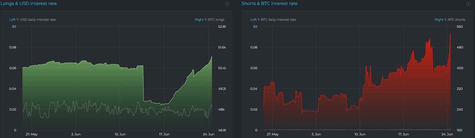 Theo datamish, vị thế Long Bitcoin hiện tại trên Bitfinex là 50,894 BTC, trong khi vị thế Short chỉ là 535 BTC. Số BTC của vị thế Long đã được bổ sung thêm 2,580 BTC kể từ ngày 17/6, xóa sạch mức giảm trước đó.
