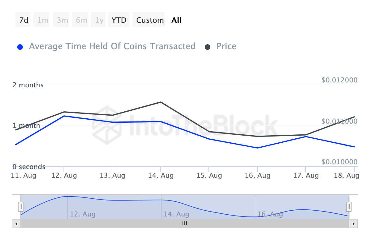 Cụ thể, theo IntoTheBlock, thời gian giữ trung bình của các coin được giao dịch trên mạng lưới của Notcoin đã giảm gần 62% trong tuần qua. Ngoài ra, khối lượng coin được giao dịch trong 30 ngày qua cũng đã giảm. Chỉ số Coins Holding Time theo dõi thời gian một tiền điện tử được giữ trước khi được bán hoặc giao dịch. Khi chỉ số này tăng, nó cho thấy các chủ sở hữu không muốn bán, dẫn đến sự ổn định hoặc tăng giá.