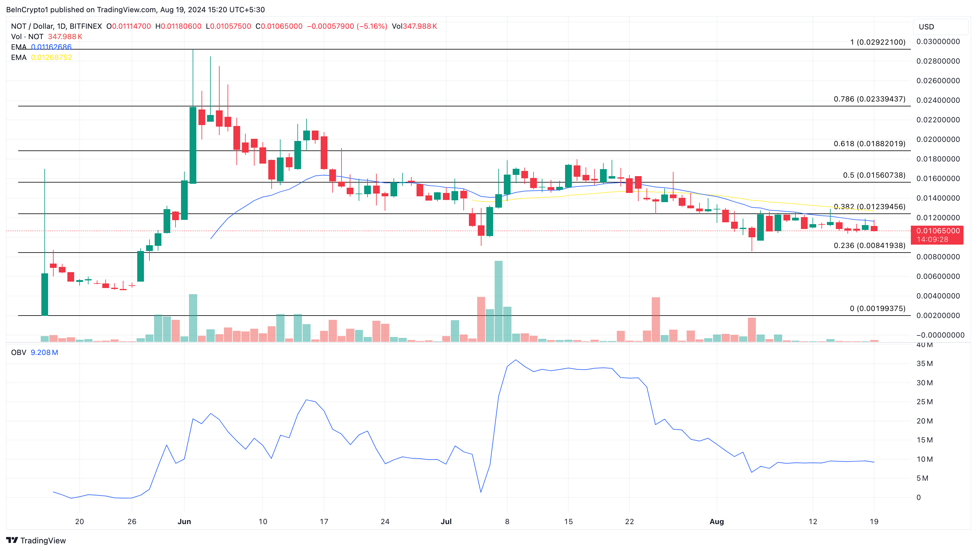 Ngoài ra, chỉ số On Balance Volume (OBV), một chỉ số đo lường áp lực mua và bán, đang ở mức bằng phẳng. Điều này ngụ ý rằng NOT đang thiếu sự tích lũy. Trừ khi cấu trúc thị trường của Notcoin cải thiện, giá của tiền điện tử này có thể giảm xuống 0.0084 USD. Tuy nhiên, nếu các nhà đầu tư thấy phù hợp để mua vào khi giá giảm và giá tăng trên EMA 20 ngày, xu hướng có thể đảo ngược. Nếu điều này xảy ra, giá của NOT có thể đạt 0.012 USD.