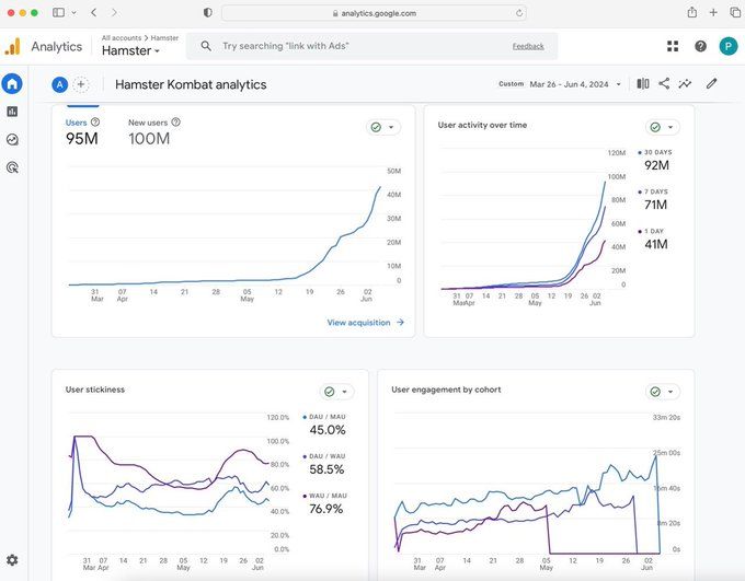 SponsoredTheo dữ liệu được BeInCrypto ghi nhận từ trang X chính thức của dự án, ngày 05/06 vừa qua, dự án đã công bố đạt được 100 triệu người dùng, cao hơn rất nhiều so với chỉ 35 triệu người dùng của Notcoin. Tuy nhiên, con số 100 triệu này dường như chỉ là số lượng người truy cập website của dự án mà thôi. Dự án cũng chưa công bố rõ liệu trong 100 triệu người dùng này thì có bao nhiêu người tham gia khai thác Hamster Kombat và tỷ lệ người dùng quay lại khai thác hàng ngày là bao nhiêu.