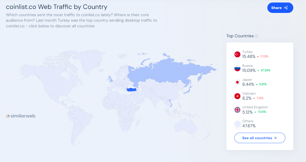 Mặc dù Việt Nam vẫn nằm trong top các quốc gia có lượng truy cập đến trang chủ của Coinlist nhiều nhất, chiếm 8.2%, nhưng trên thực tế nó cũng đã ghi nhận sự sụt giảm đến 7.21%. Trái ngược lại, Thổ Nhĩ Kỳ và Nga là hai quốc gia hàng đầu trong bảng danh sách này.