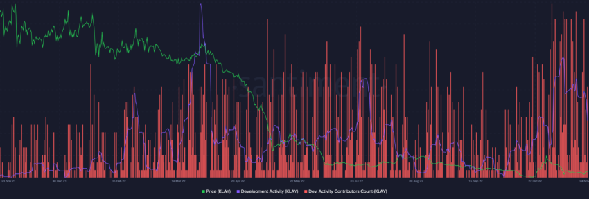 Đáng chú ý, hoạt động phát triển của Klaytn tiếp tục tăng bất chấp xu hướng giảm chung của thị trường tiền điện tử. Hoạt động phát triển cho mạng đạt mức cao cục bộ vào khoảng ngày 09/11 và vẫn tăng dần đều sau đó.